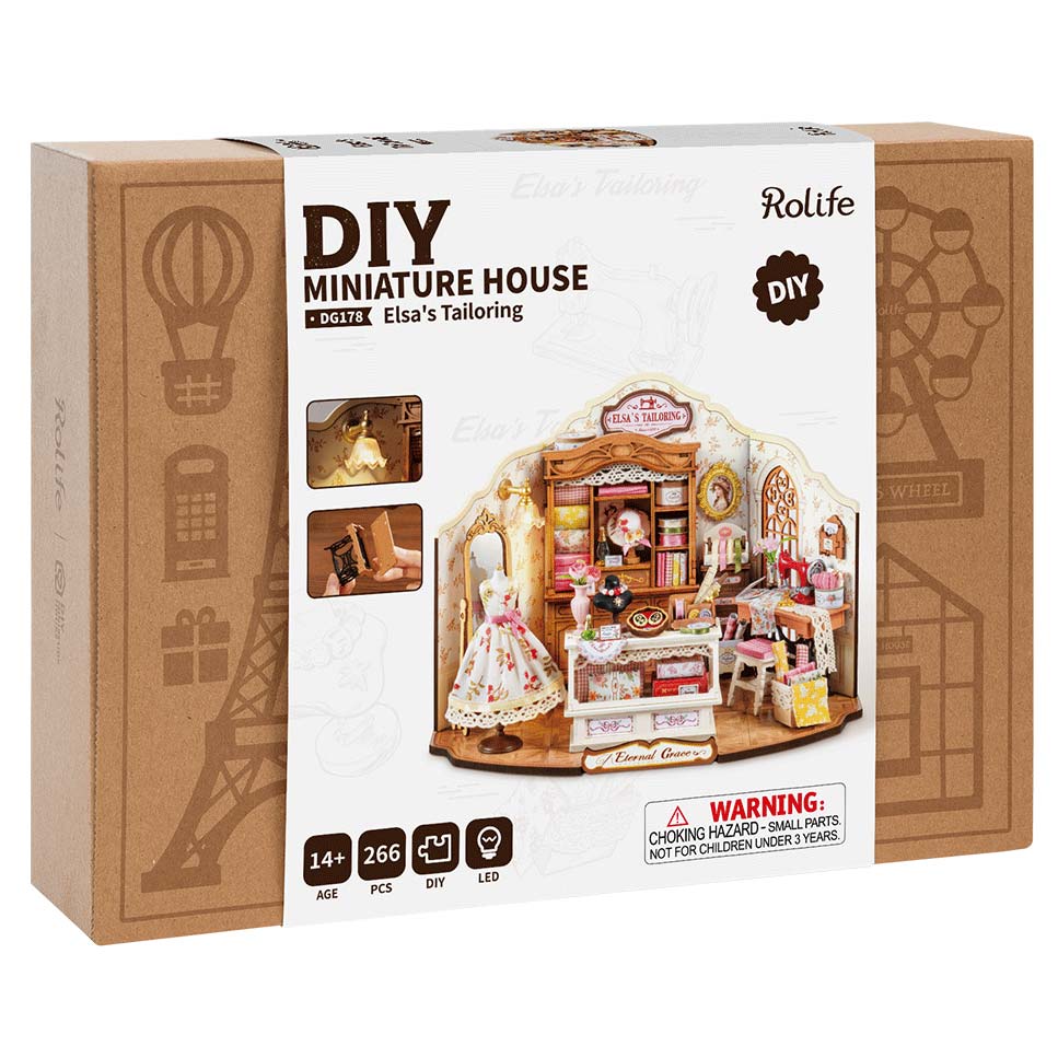Die DIY Miniature Houses von Rolife sind im Maßstab 1:24 angelegt. Die Bausätze bestehen aus vielen einzelnen Zubehörteilen, die in separaten Beuteln sortiert sind. Für den Aufbau gibt es eine Schritt-für-Schritt-Anleitung, benötigte Farbe, Klebstoff und kleine Werkzeuge wie Pinsel, Pfeile oder Pinzette sind im Lieferumfang enthalten. Der Bausatz besteht aus umweltfreundlichen Materialien, die Farbe ist geruchlos und kann auch leicht mit Wasser ausgewaschen werden.
