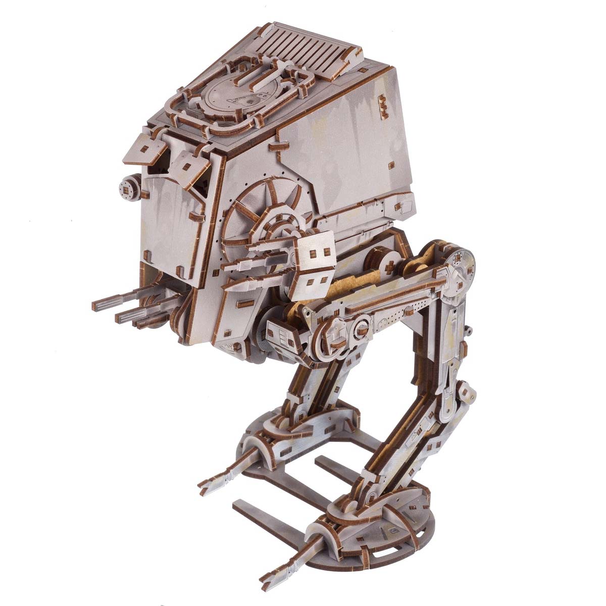 Der AT-ST Walker wird von einer Feder angetrieben und kann 60-80 cm zurücklegen; dabei bewegt er sich langsam und natürlich, praktisch genauso wie sein filmisches Gegenstück. Der Kopf dreht sich hin und her, während sich das Modell bewegt, um eine breite Angriffslinie sicherzustellen. Am Kinn montierte Blasterkanonen und eine an der Wange montierte leichte Blaster und ein Granatwerfer lassen sich mit der Hand hoch- und runterdrehen, die Fenster der Pilotenkanzel und die Dachluke können per Hand geöffnet werden. Das Modell besteht aus farbigem Sperrholz, und zahlreiche graphische Details an der Außenseite verleihen ihm ein realistisches Aussehen. Verschiedene Komponenten aus Metall machen es haltbarer und stabiler. Ziehen Sie den AT-ST Walker auf, indem Sie den verborgenen Schlüssel in die rechte Seite des Kopfs stecken und dann gegen den Uhrzeigersinn drehen. Halten Sie den Körper des Walkers beim Aufziehen fest (aber nicht am Kopf oder an den Beinen, da diese weniger robust sind). Stellen Sie das Modell dann auf eine ebene Fläche, drücken Sie auf den Start/Stopp-Schalter an der Vorderseite des Körpers und schicken Sie den AT-ST so auf seine Mission, um rebellische Widerstandsnester zu zerschlagen!