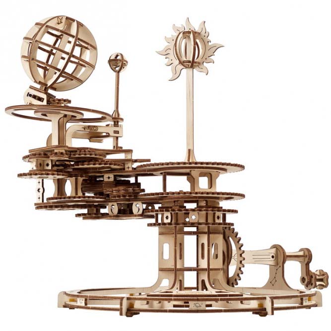 Das Mechanische Tellurium von Ugears kann manuell eingestellt oder justiert werden, um zu zeigen, welche relativen Positionen Sonne, Erde und Mond an einem bestimmten Tag einnehmen. Stellen Sie beim Justieren des Mechanismus den Zeiger auf der Jahreszeitenscheibe in die Mitte von Winter oder Sommer (Summer). Die Erde kann (mithilfe des Zahnrads unter den Mondphasen) um ihre Achse gedreht werden, damit eine Hemisphäre mitten im Winter so weit wie möglich von der Sonne entfernt ist bzw. im Sommer der Sonne so nahe wie möglich ist. Um das aktuelle Datum einzustellen, drehen Sie die Kurbel um die Anzahl der Tage vorwärts oder rückwärts, die dieses Datum von der zeitlich am nächsten liegenden Sonnenwende entfernt liegt. Nachdem Sie den Mondkalender zurate gezogen haben, positionieren Sie den Mond mithilfe des oberen Zahnrads auf seine korrekte Phase. Jetzt ist Ihr Tellurium eingerichtet. Bewegen Sie die Kurbel des Modells jeden Tag um eine Umdrehung, um das Voranschreiten der Erde auf ihrem Weg um die Sonne und den Zyklus des um die Erde kreisenden Mondes zu erfassen.