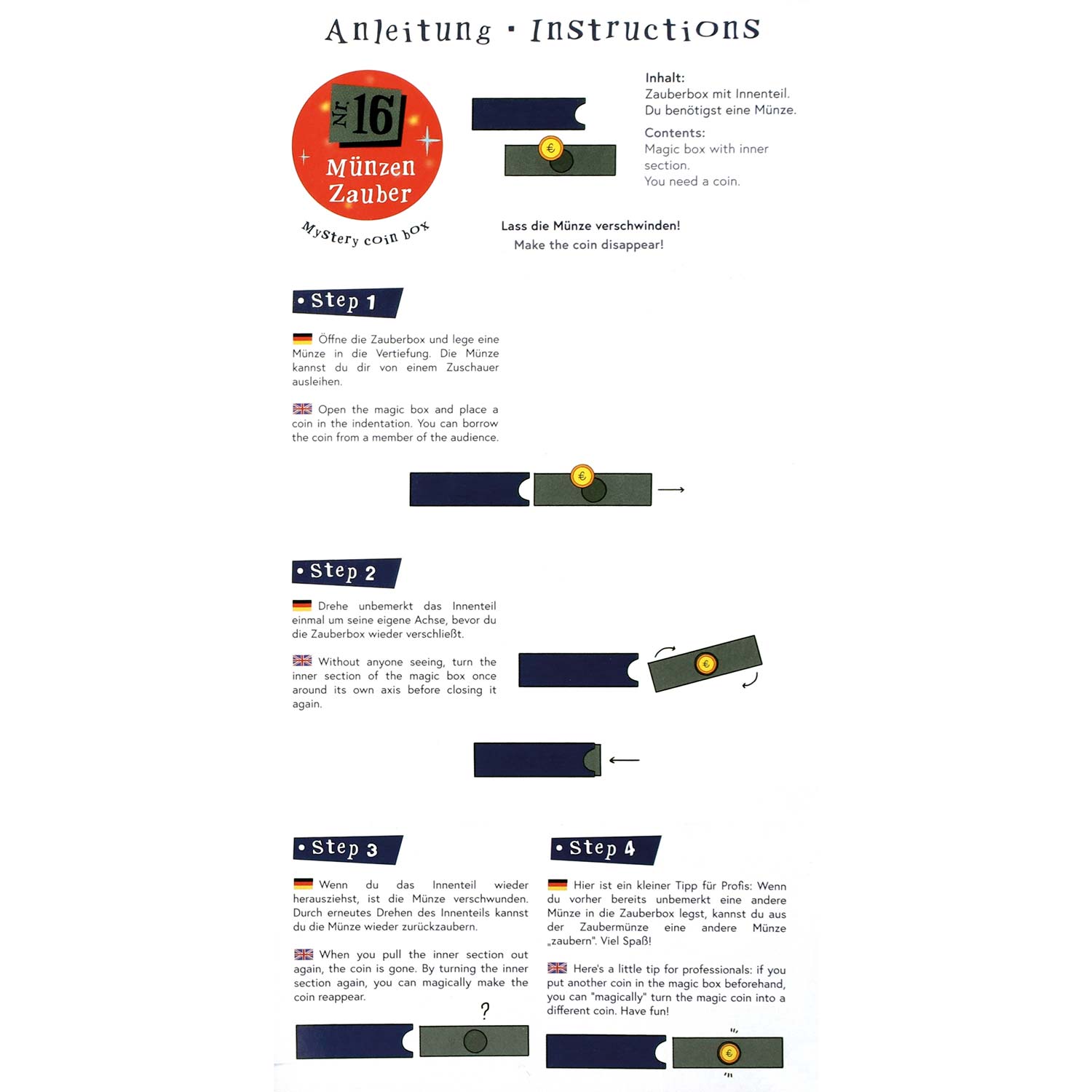 Lass die Münze verschwinden! Mit diesem Zaubertrick kannst du eine Münze auf magische Weise verschwinden und anschließend wieder auftauchen lassen. Oder du verwandelst die Münze in eine andere Münze - dein Publikum wird staunen! Die leicht verständliche, bebilderte Anleitung zeigt dir, worauf es bei dieser verblüffenden Illusion ankommt. Zusätzlich erhältst du 5 Tickets, mit denen du zu deiner eigenen MAGIC SHOW einladen kannst.