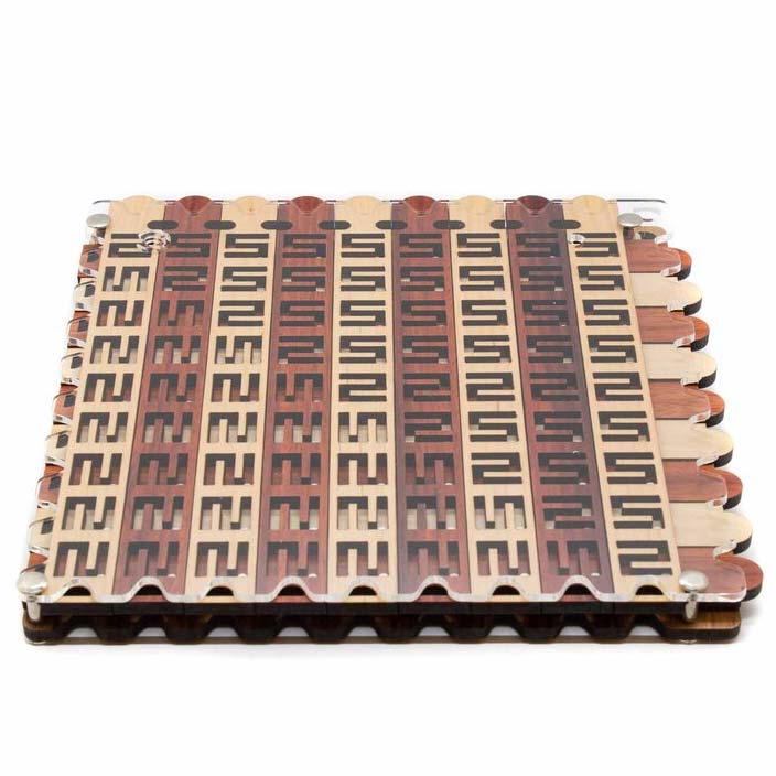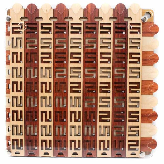 N5-9 ist ein relativ großes, systematisches Labyrinth-Puzzle von Jean Claude Constantin. Die Schiebeelemente haben Aussparungen in Form von einem N oder einer 5, daher der Name dieser Labyrinth-Serie. Dieses Puzzle gibt es in unterschiedlichen Größen. Aufgabe ist es, eine kleine Metallkugel durch das Ausgangsloch aus dem Labyrinth zu befreien. Dies erreichen Sie, indem die Holzschieber um die festen Metallstifte herum manövriert werden, bis die Öffnung frei von Hindernissen ist. Ein sehr komplexes, methodisches und faszinierendes Puzzle!