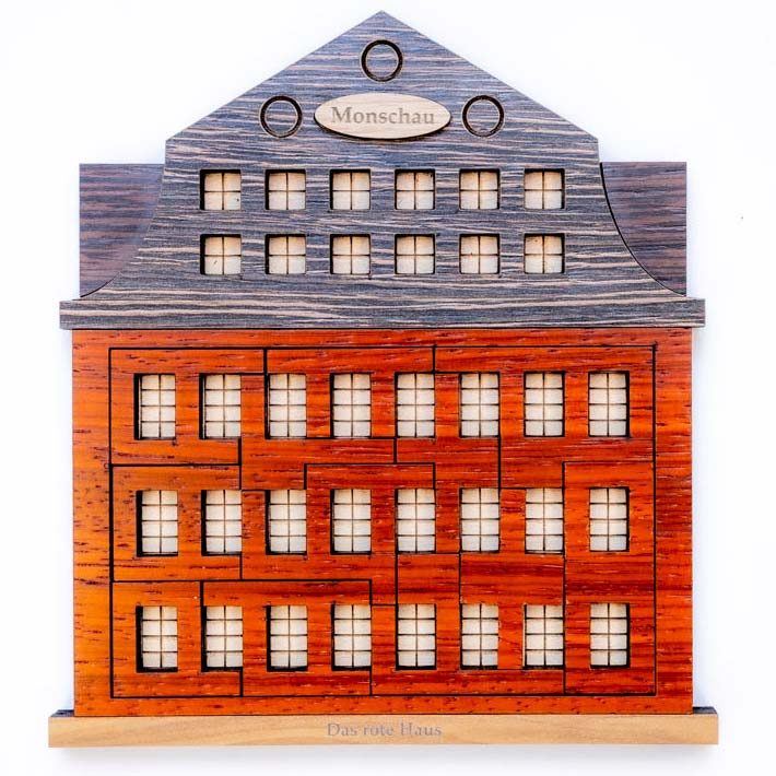Das rote Haus von Siebenstein-Spiele ist ein klassisches Legepuzzle. Die Puzzleteile beinhalten die Fenster des Hauses. Aufgabe ist es, das Haus ind er Form zu kompletieren.