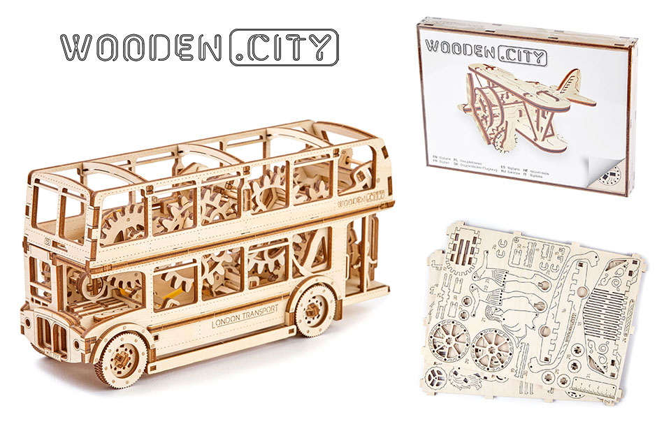 Zum Start gibt es vier Modelle von Wooden.City: Den London Bus, das Doppeldecker Flugzeug (Biplane) sowie aus früherer Zeit den Römischen Wagen und den Da Vinci Wagen. Voraussichtlich im Juni werden drei weitere Modelle folgen.