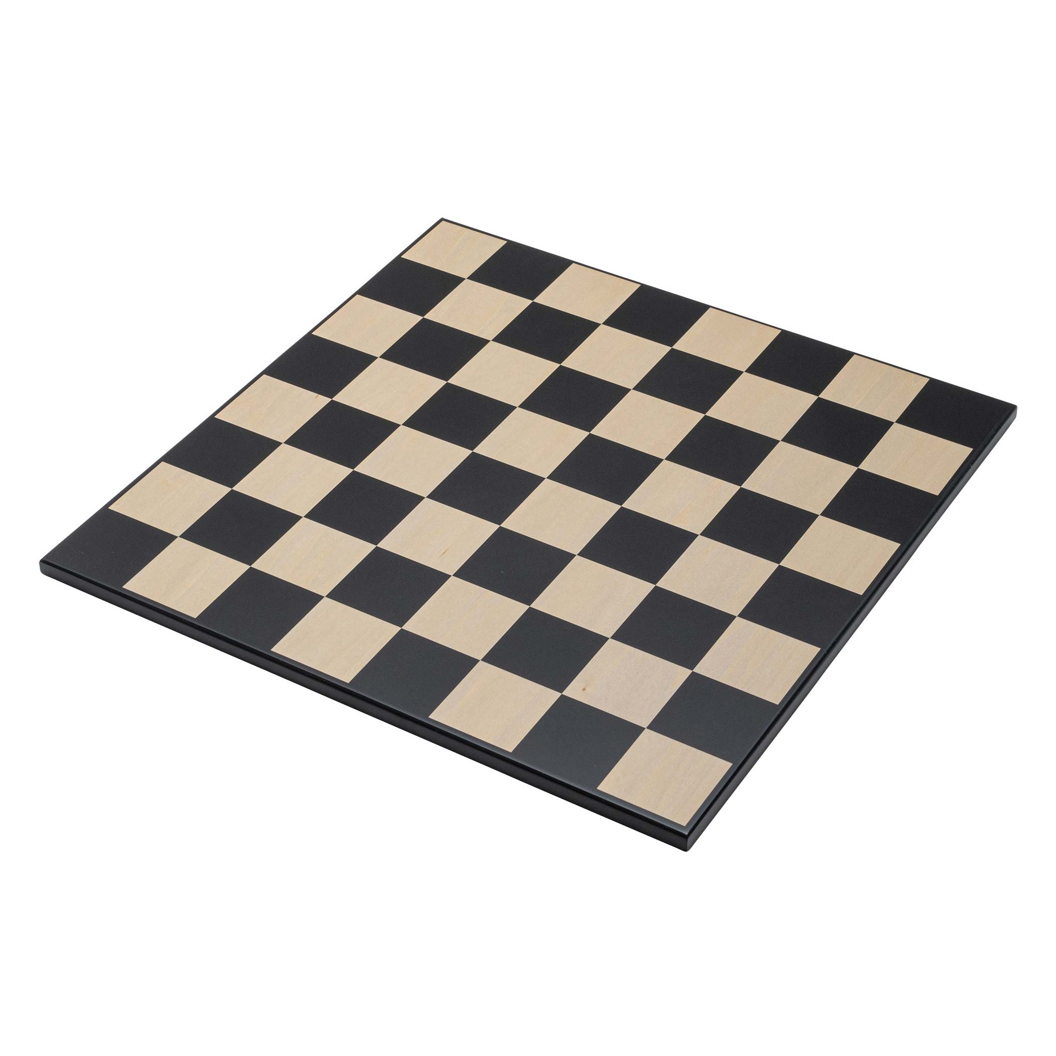 Schachbrett aus MDF mit Ahorn Furnier, natur und schwarz bedruckt, Gummiuntersetzer, Maße 450 x 450 x 13 mm, Feld 55 mm.