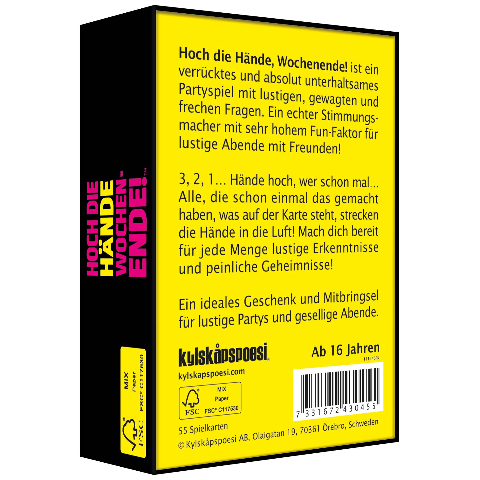 Hoch die Hände, Wochenende! ist ein verrücktes und absolut unterhaltsames Partyspiel mit lustigen, gewagten und frechen Fragen. Ein echter Stimmungsmacher mit sehr hohem Fun-Faktor für lustige Abende mit Freunden!